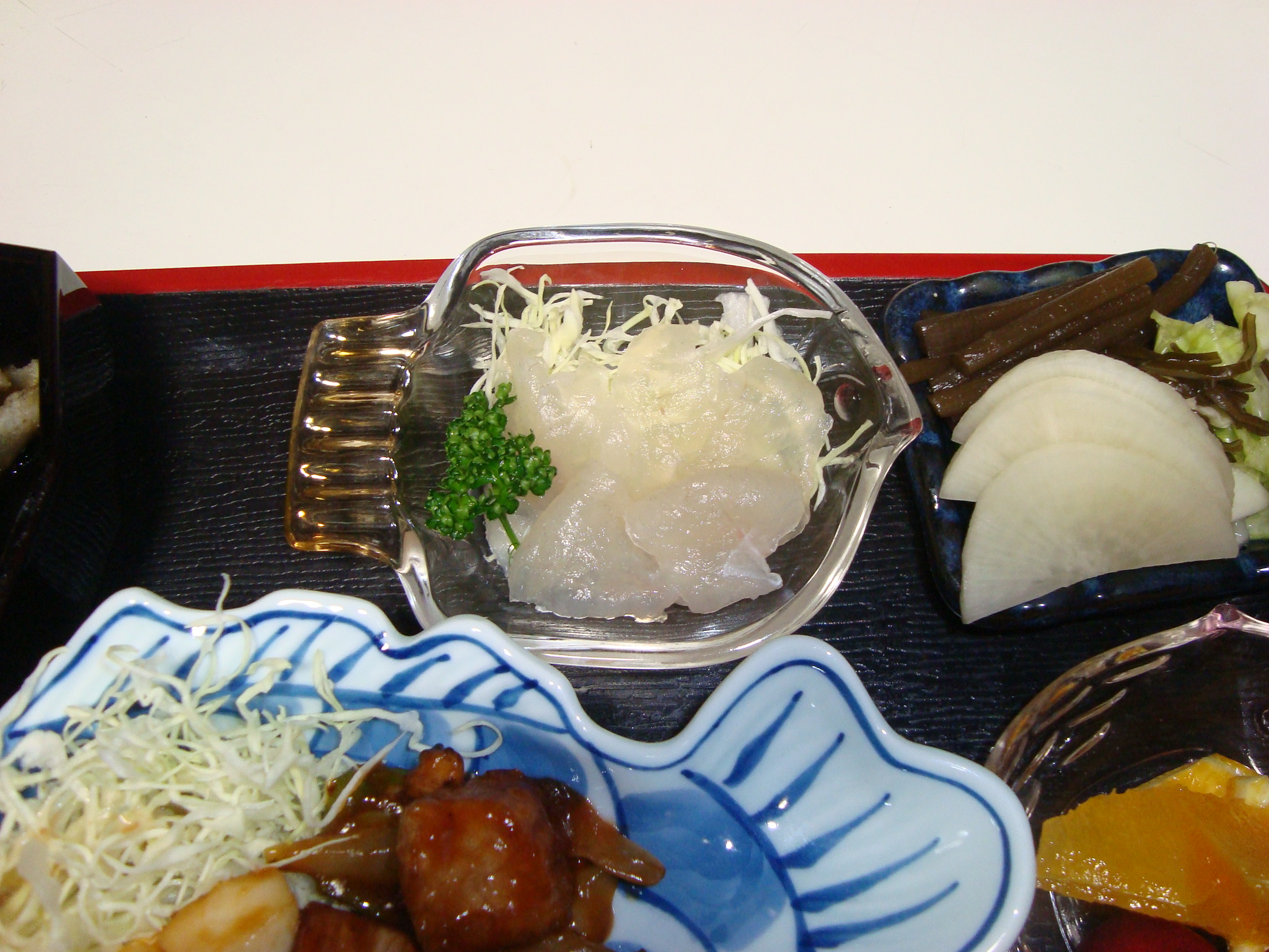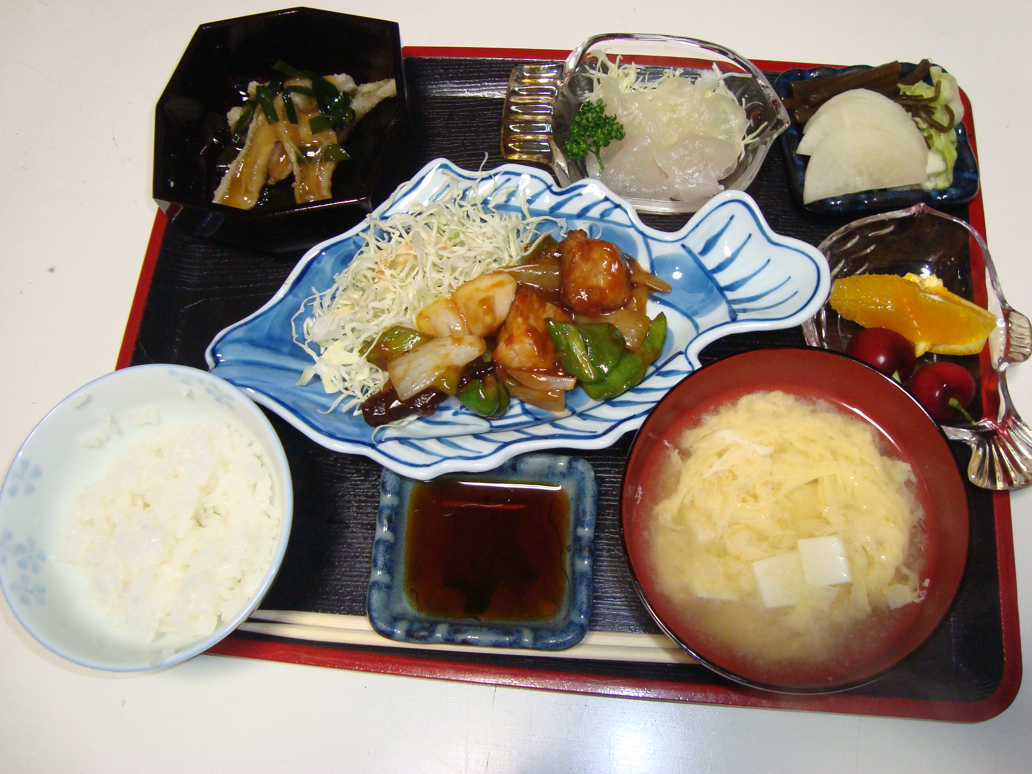 夕食は、弟が裏で釣ったキスのあんかけとフグのお刺身が付いた酢豚定食