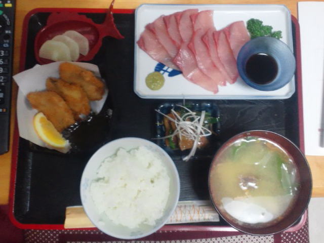 シイラのフライに刺身とシイラのアラの味噌汁です。