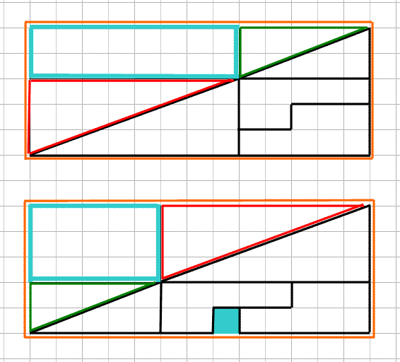 図で、赤、緑、オレンジ、黄緑の4つのパーツを含む一見、三角形に見える擬似三角形の斜辺を除く二辺を長辺、短辺とする長方形(私の図でオレンジ色の長方形)の面積は、